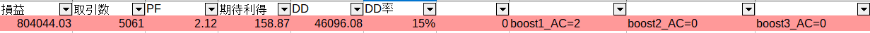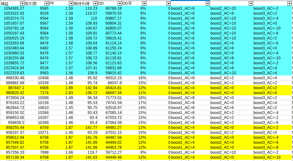 デフォルトのboost値1,2,3がそれぞれ0の場合は、PF2.2程度、損益 555k、取引数 3645でした。